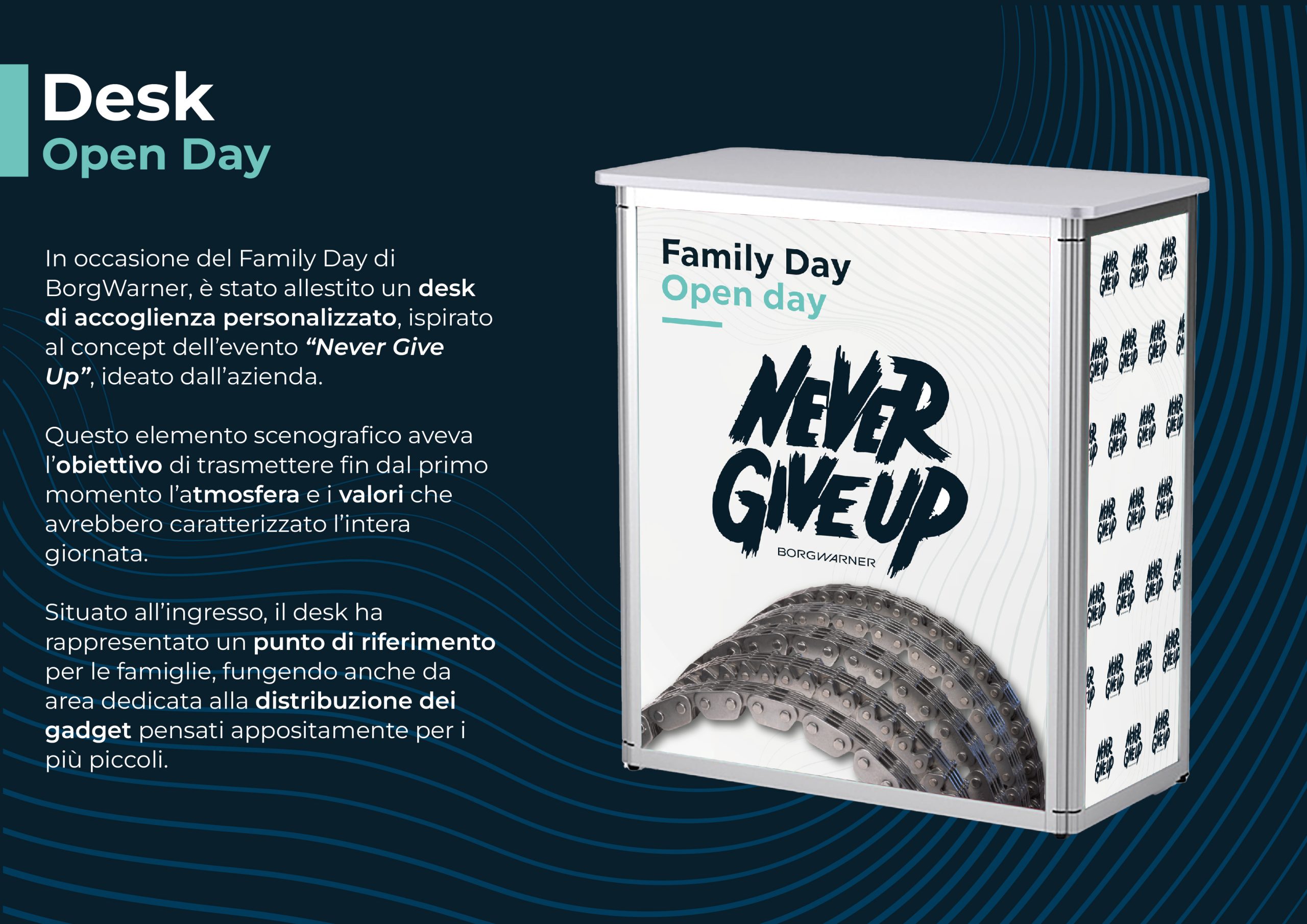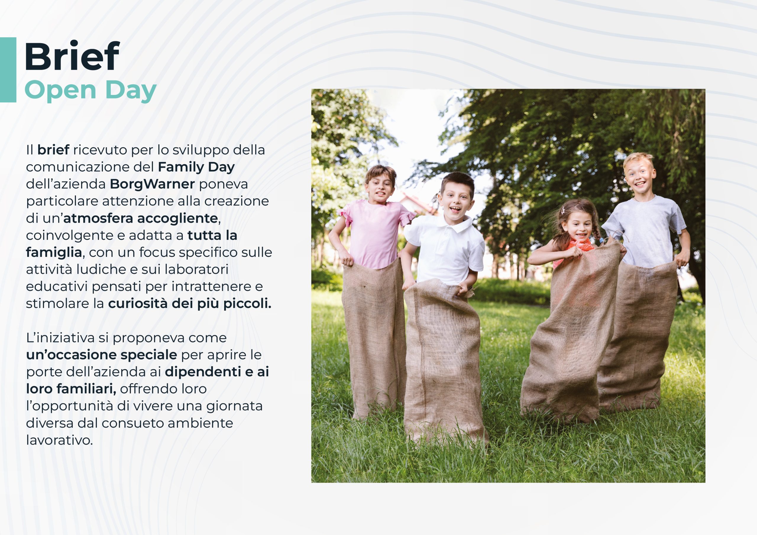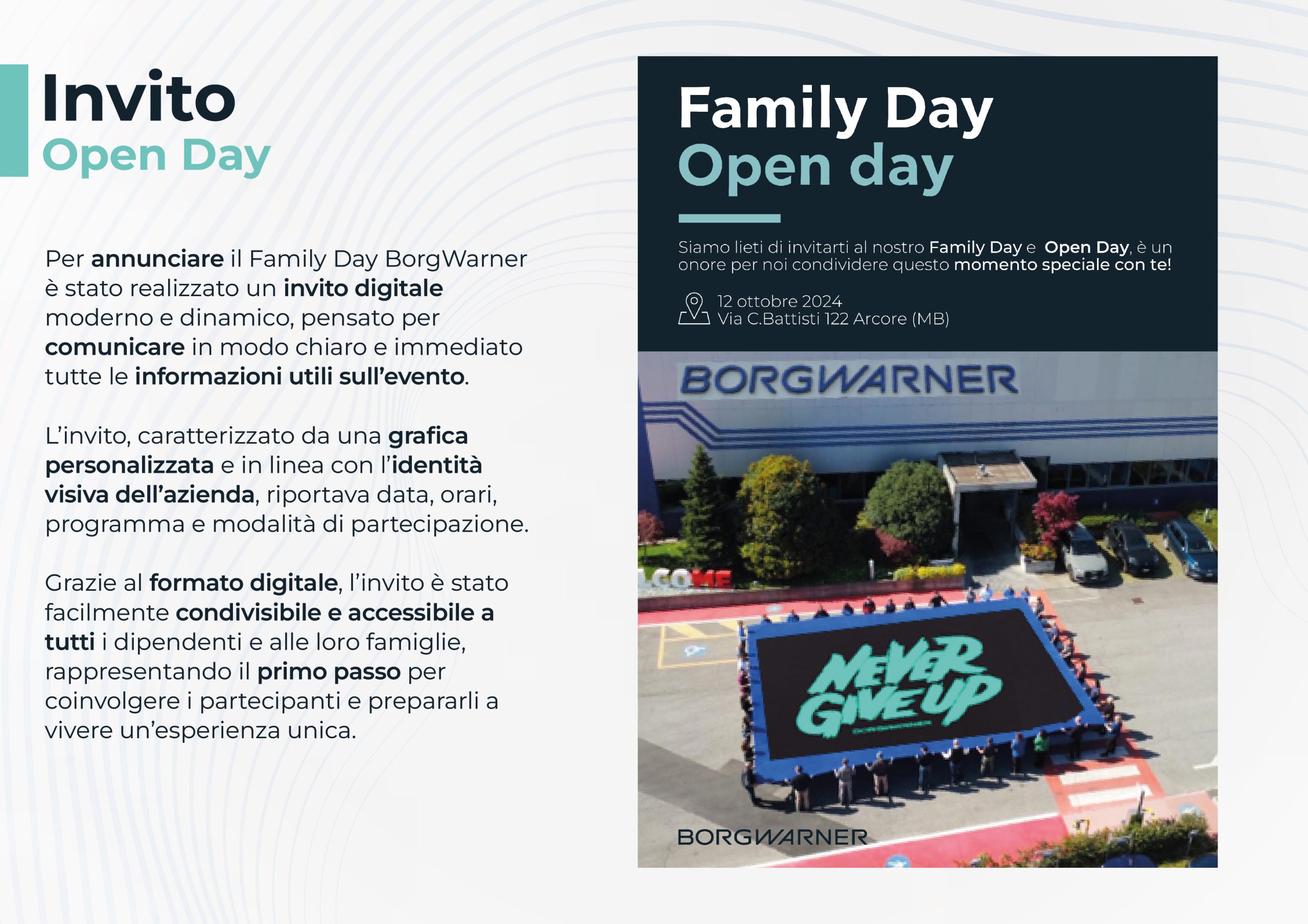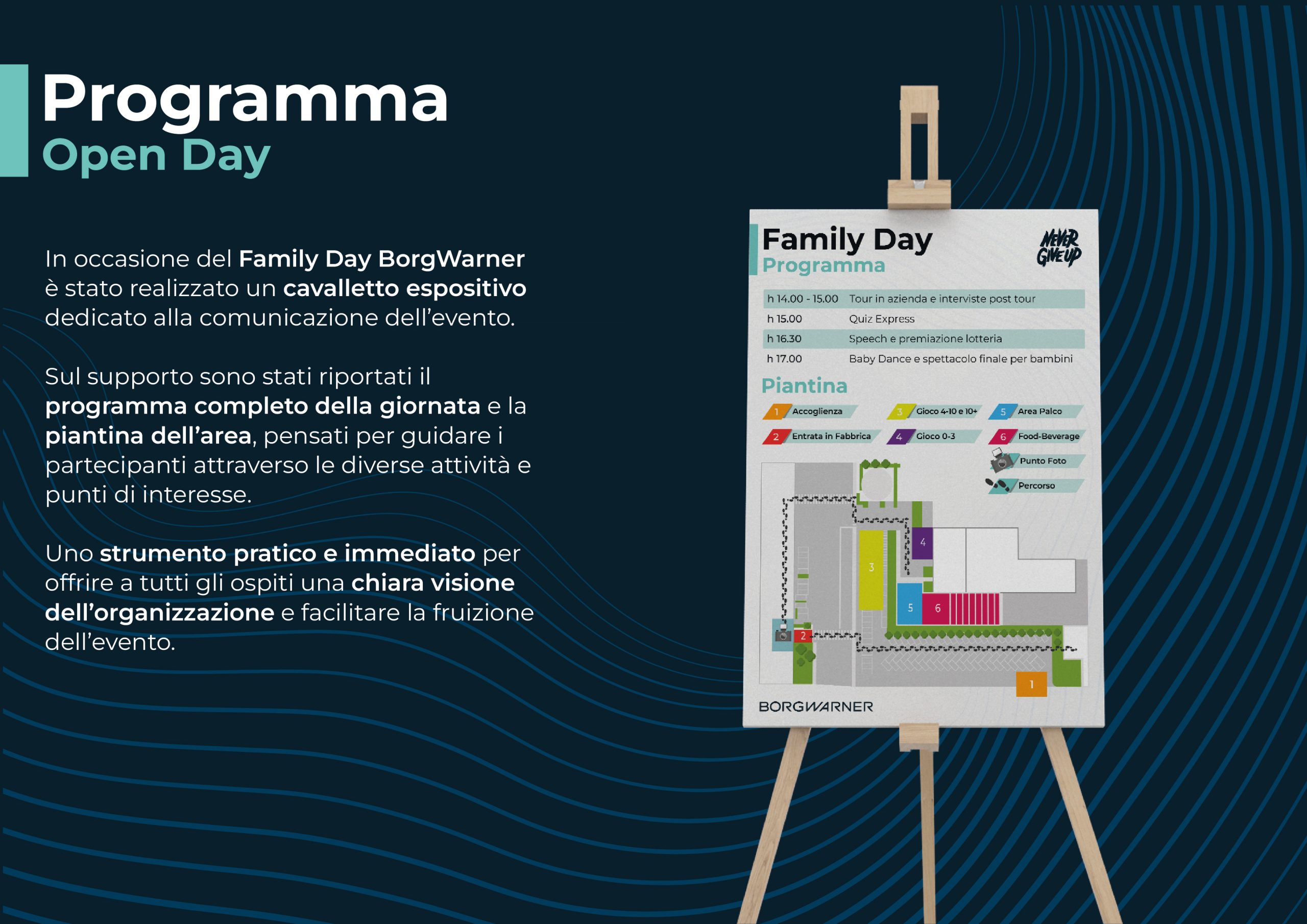 Per il Family Day di Borgwarner, tramite l’azienda Aladino srl, ho curato lo sviluppo della comunicazione dell’evento.